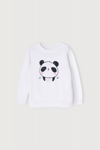 Вязаный джемпер с втачными рукавами. Украшен изображением тигрёнка. Связан из хлопковой пряжи. На рукавах эластичные манжеты. Внизу мягкий пояс. Застёгивается на пуговицу.