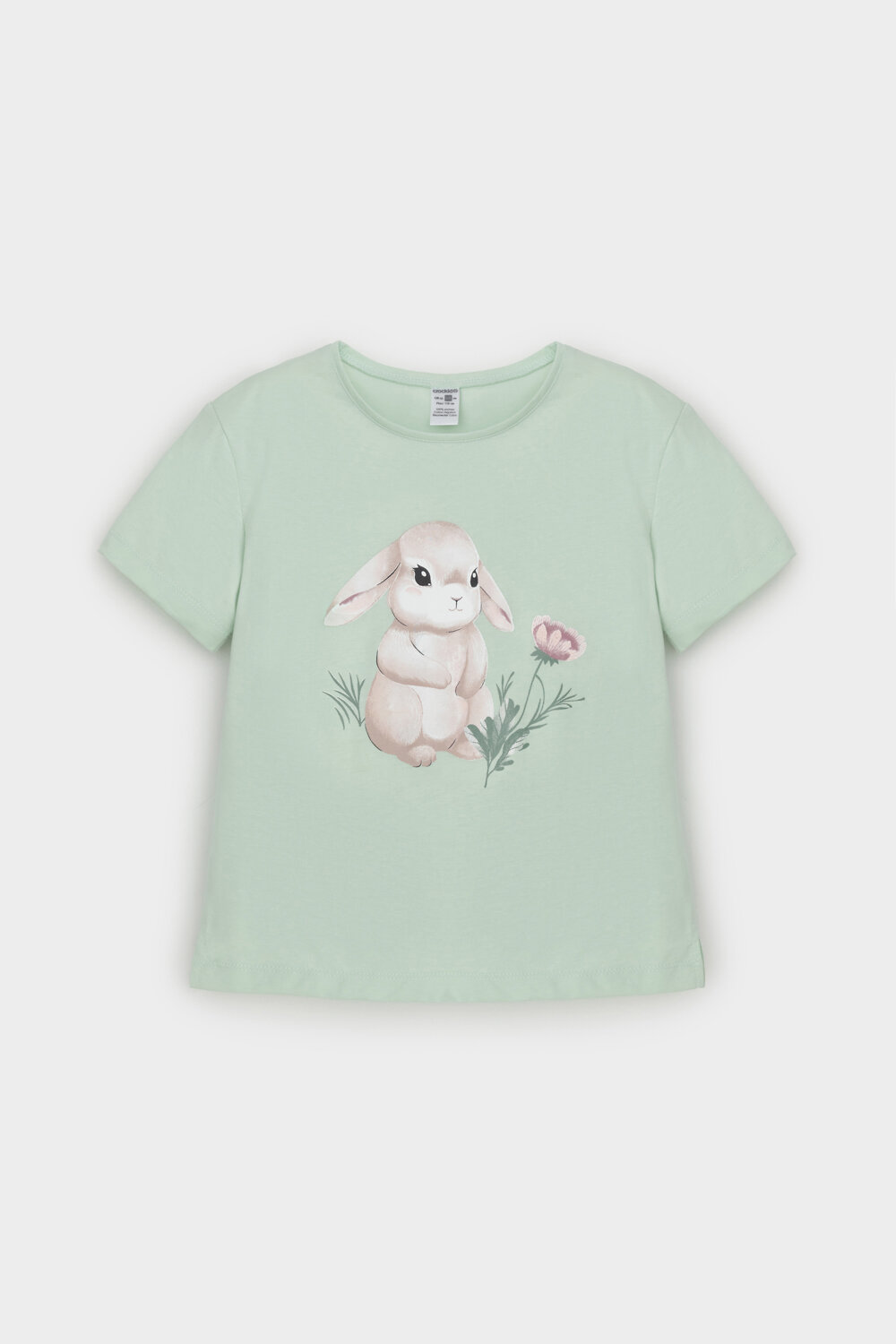 Футболка для девочки из гладкого трикотажа, произведённого из высококачественного натурального хлопка. Для удобства в размерах 92 и 98 имеется застежка на кнопки на спинке. Оригинальный принт выполнен из стойких текстильных красителей. Изделие сохраняет цвет и форму после многократных стирок.