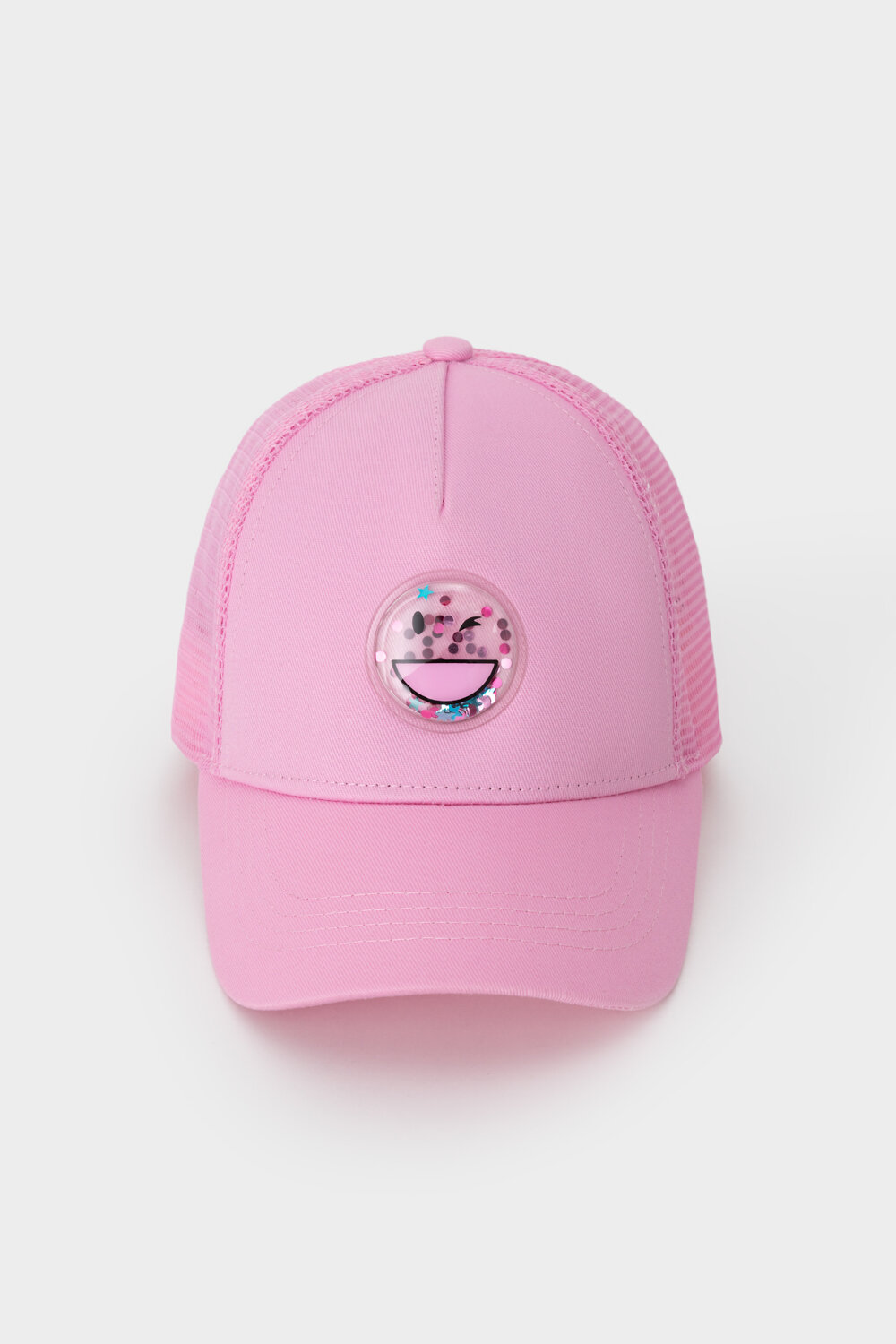 Кепка для девочки из текстиля и сетки. Спереди украшена оригинальной нашивкой с блёстками. Регулируется по ширине головы и фиксируется на затылке с помощью пластиковой застёжки.