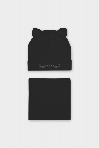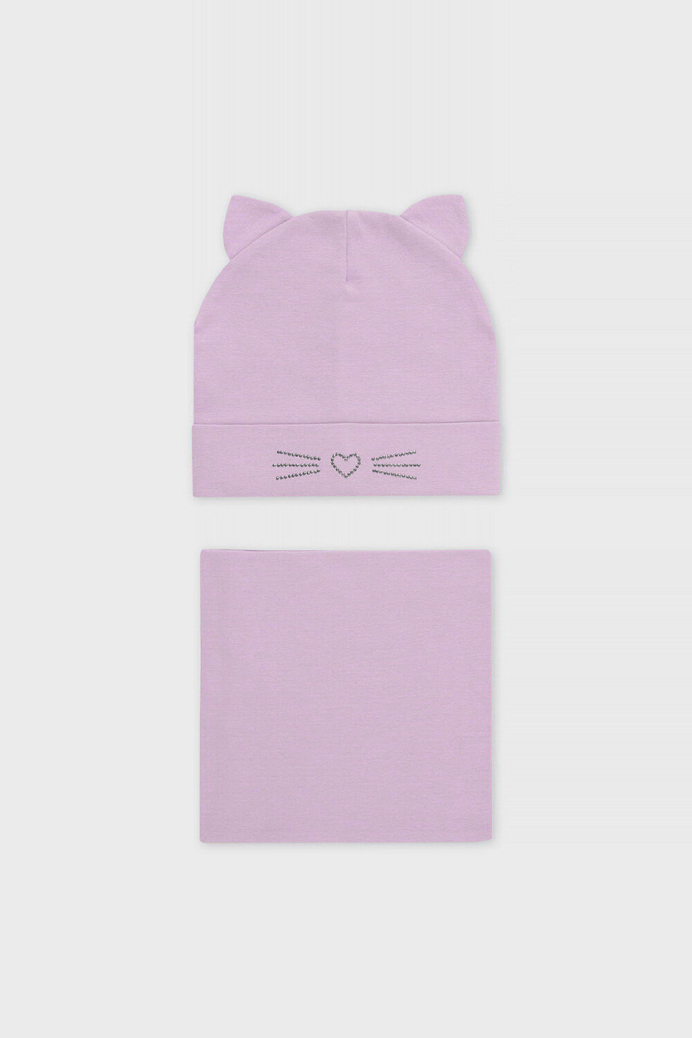 Комплект для девочки: шапка и снуд из хлопкового трикотажа с добавлением эластана, окрашенного стойкими гипоаллергенными текстильными красителями. Изделия хорошо тянутся, после многократных стирок сохраняют цвет и форму.