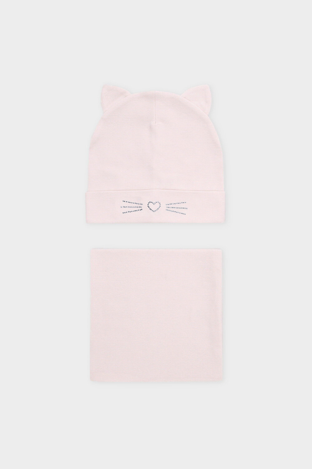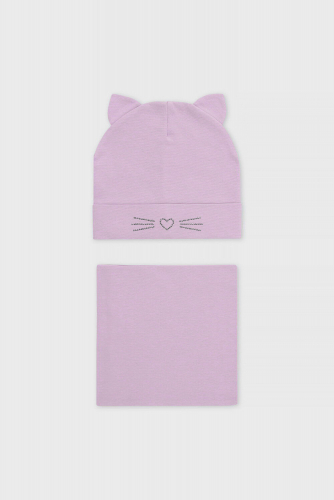 Комплект для девочки: шапка и снуд из хлопкового трикотажа с добавлением эластана, окрашенного стойкими гипоаллергенными текстильными красителями. Изделия хорошо тянутся, после многократных стирок сохраняют цвет и форму.