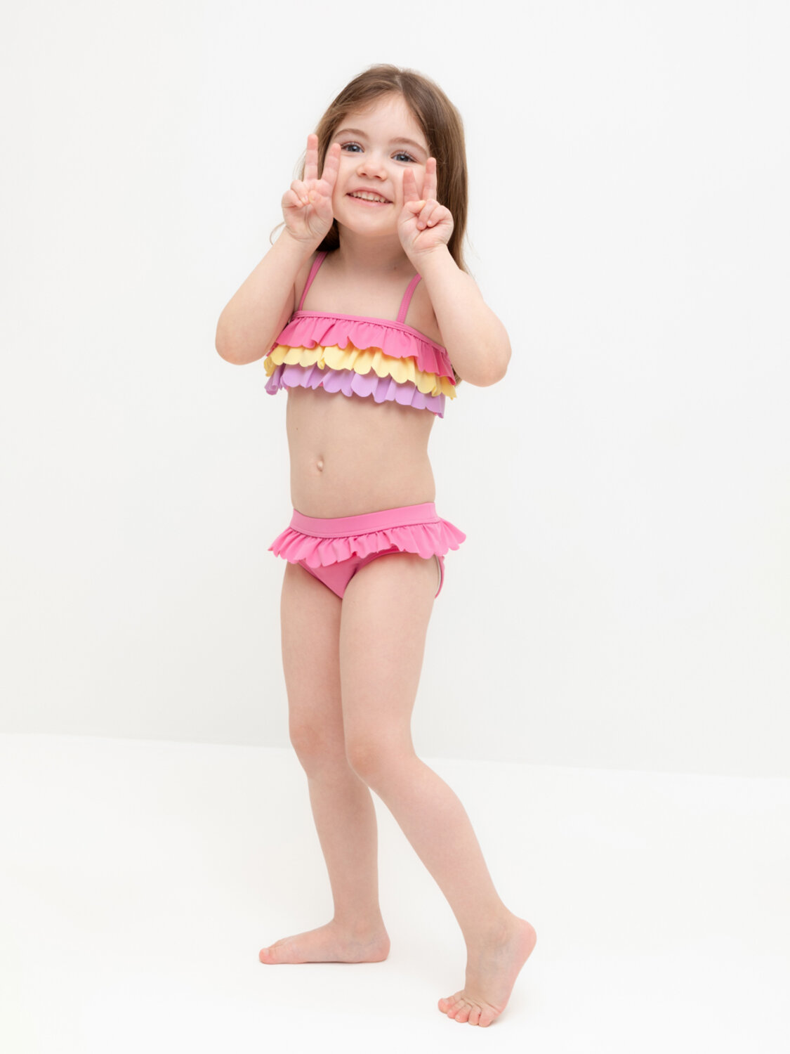 Раздельный купальник для девочки. Топ на регулируемых бретелях и плавки на эластичной резинке. Внутри подклад. Украшен воздушными оборками.
