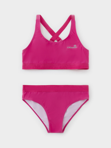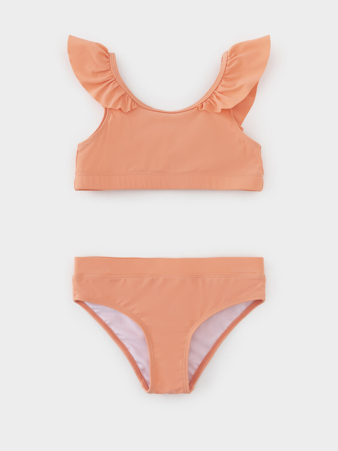 Раздельный купальник для девочки. Топ на эластичных лямках и плавки на резинке. Внутри подклад. Украшен воздушными оборками.