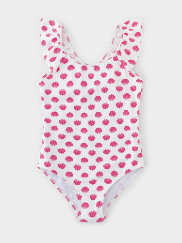 Раздельный купальник для девочки. Топ на регулируемых бретелях и плавки на эластичной резинке. Украшен оборками. Оригинальная набивка выполнена из стойких гипоаллергенных красителей.