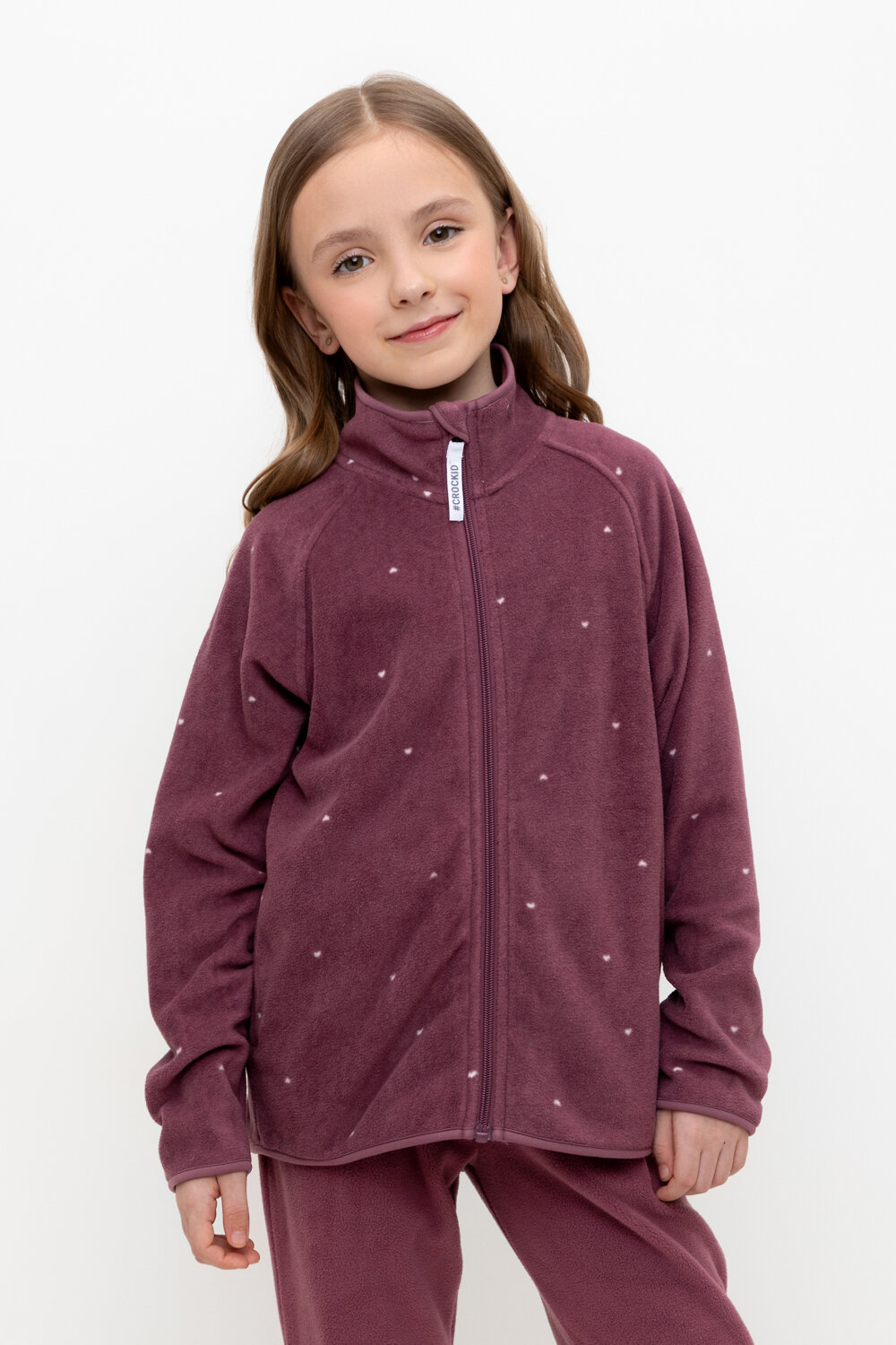 Флисовая куртка для девочки. У изделия удлинённая спинка, высокий воротник, предусмотрена защита шеи и подбородка. Рукава-реглан и низ изделия обработаны эластичным кантом для лучшего прилегания к телу, по бокам два кармана. Оригинальная набивка выполнена из стойких, гипоаллергенных текстильных красителей. Куртка сохраняет цвет и форму после многократных стирок.