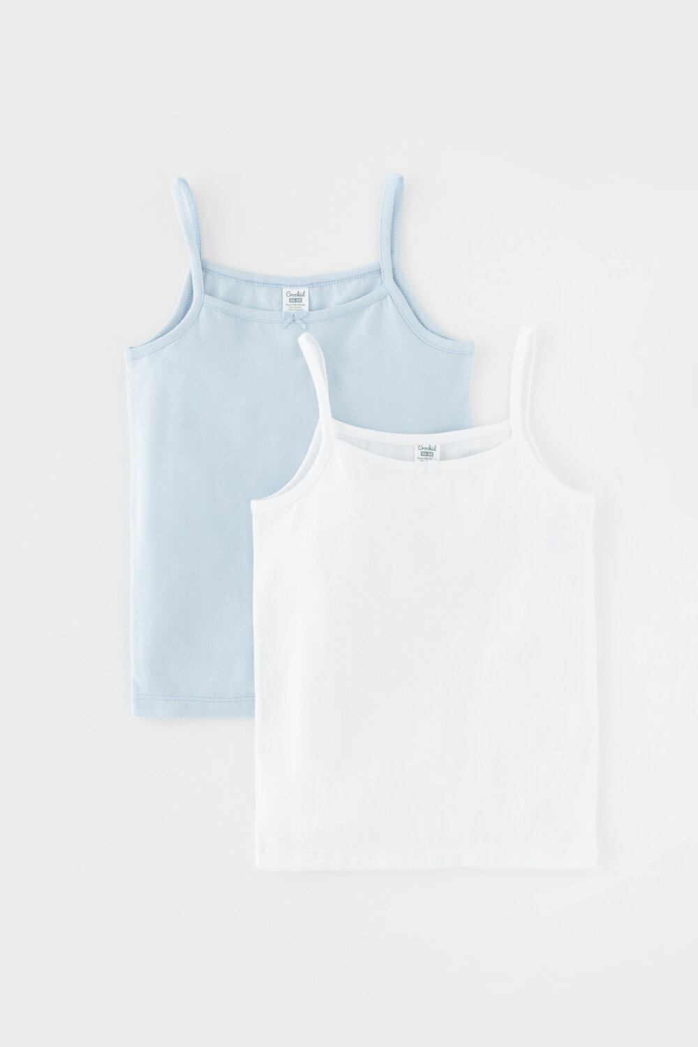 Трикотажные майки в комплекте 2 шт на тонких бретелях из однотонного супрема с эластаном, горловина спинки и проймы обработаны кантом, по горловине полочки декоративная эластичная тесьма и атласный бантик. Сохраняют цвет и форму после многократных стирок. Все трикотажные полотна производятся в соответсвии с нормами Швейцарского сертификата ЭкоТекс.