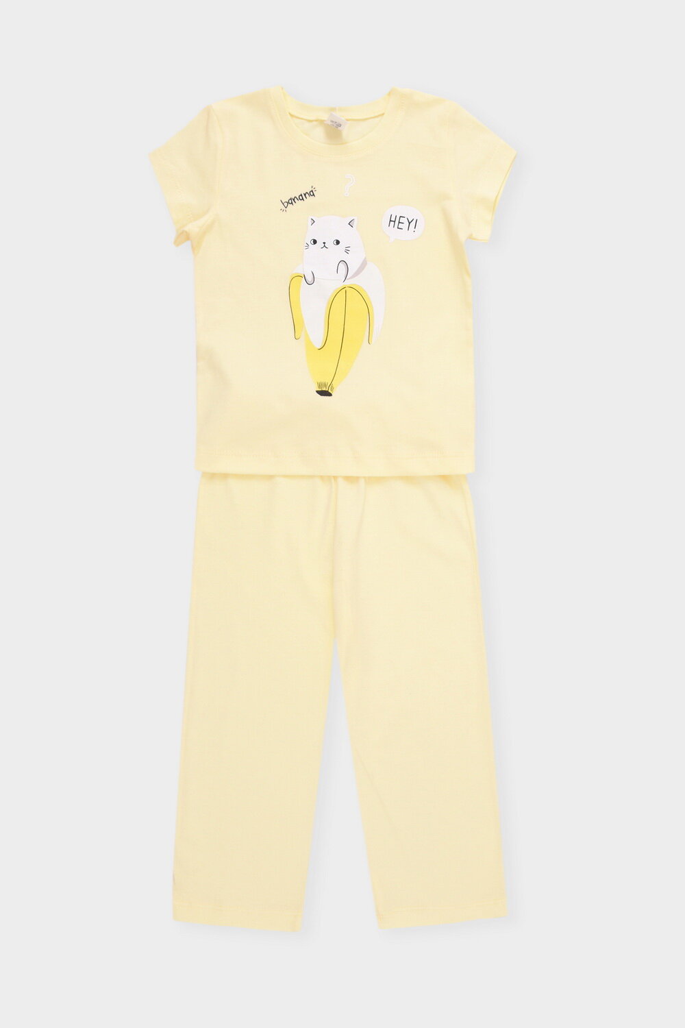 Трикотажный пижамный комплект из натурального хлопка. У футболки короткие втачные рукава и эластичная мягкая горловина. Брюки с удобным поясом на резинке, внизу манжеты. Оригинальный принт выполнен из стойких, гипоаллергенных текстильных красителей. Все трикотажные полотна производятся в соответствии с нормами Швейцарского сертификата ЭкоТекс.