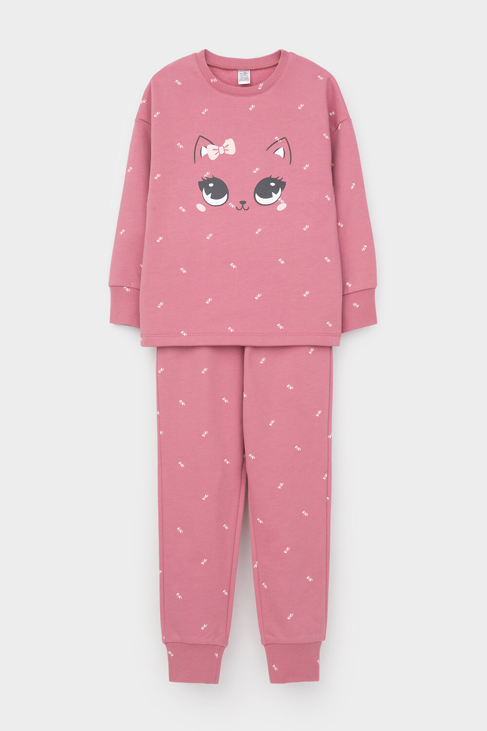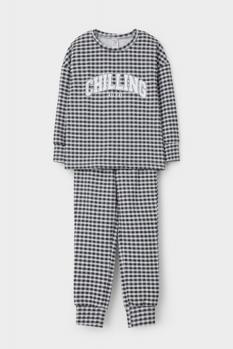 Трикотажный пижамный комплект из футера с начёсом, произведённого из натурального хлопка. У джемпера длинные рукава со спущенными плечами и эластичная мягкая горловина и манжеты. Брюки с удобным поясом на резинке, внизу манжеты. Оригинальная набивка и принт выполнены из стойких, гипоаллергенных текстильных красителей. Все трикотажные полотна производятся в соответствии с нормами Швейцарского сертификата ЭкоТекс.
