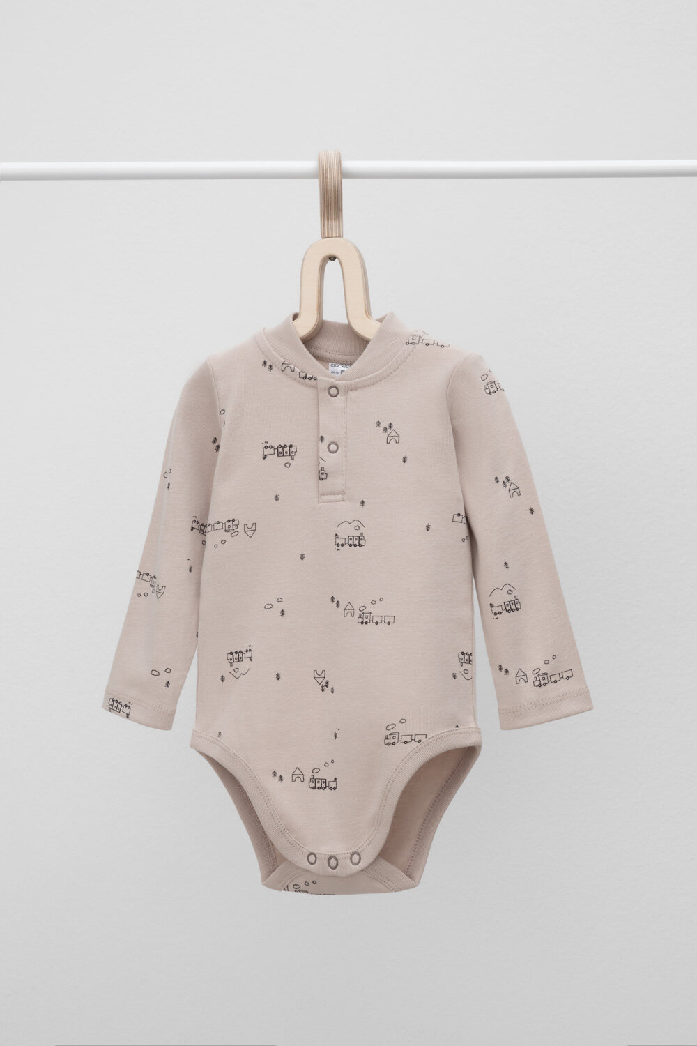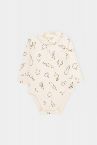 Боди из рибаны с воротником для новорожденных из мягкого, эластичного трикотажа произведенного из натурального хлопка. Застежка на кнопки на спинке. Изделие застегивается на кнопки в области паха. Все трикотажные полотна производятся в соответсвии с нормами Швейцарского сертификата ЭкоТекс.