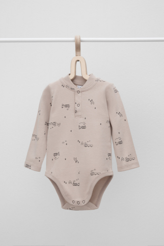Боди из рибаны с воротником для новорожденных из мягкого, эластичного трикотажа произведенного из натурального хлопка. Застежка на кнопки на спинке. Изделие застегивается на кнопки в области паха. Все трикотажные полотна производятся в соответсвии с нормами Швейцарского сертификата ЭкоТекс.
