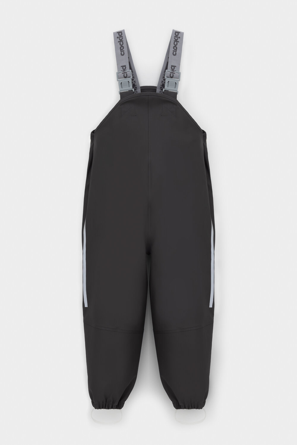Полукомбинезон без подкладки, непромокаемый, на эластичных бретелях с регулировкой длины при помощи фастекса, сбоку под проймой кнопки для регулировки объема, низ брючин с эластичной резинкой. Для фиксации полукомбинезона используются съемные силиконовые штрипки. Светоотражающий принт в виде полосы сбоку.