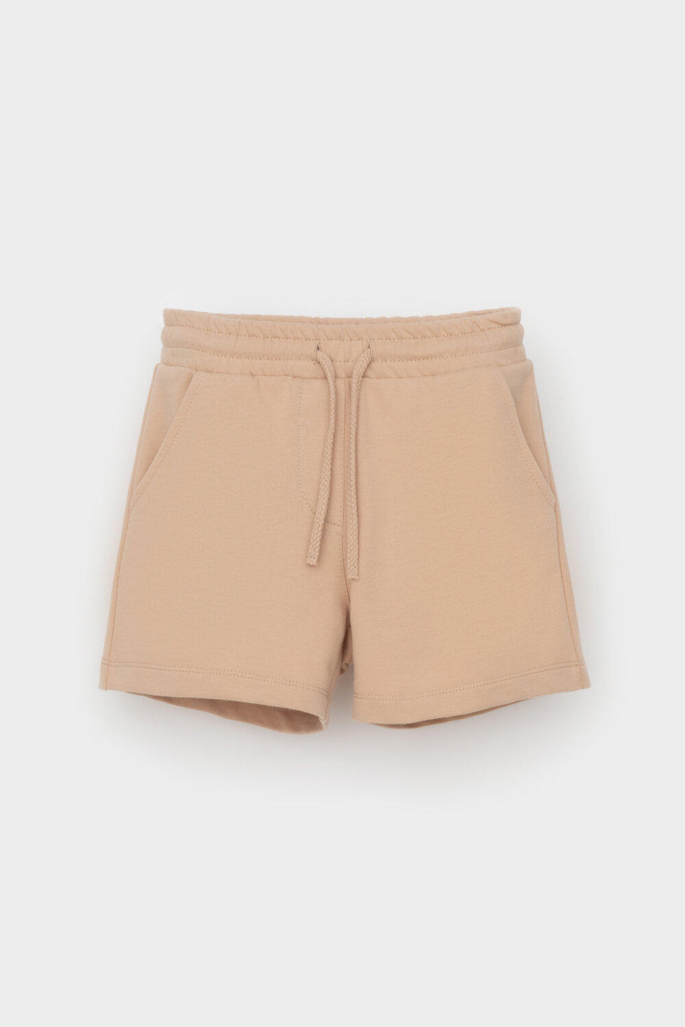 Трикотажные шорты для девочки из петельчатого футера. Эластичный пояс на резинке регулируется по ширине с помощью шнурка, по бокам два удобных кармана.