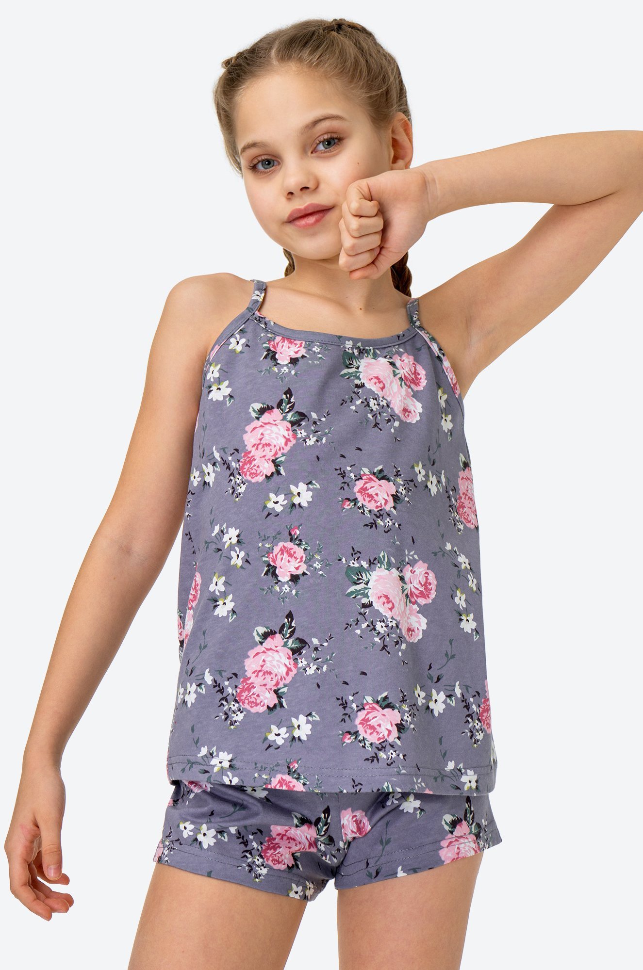 Классная пижамка с принтом цветы подарит вашей девочке не только сладкий сон, но и отличное настроение. Модель для девочек и девочек подростков выполнена из 100% хлопкового трикотажа, ткань кулирная гладь. В наборе майка на тонких бретелях и короткие шортики прямого кроя, пояс на эластичной резинке.