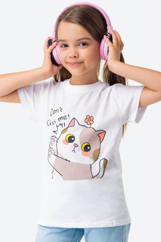 Детская футболка для девочки и девочки подростка выполнена из 100% хлопка и представлена в белом цвете. Летняя модель украшена милым принтом Котик.