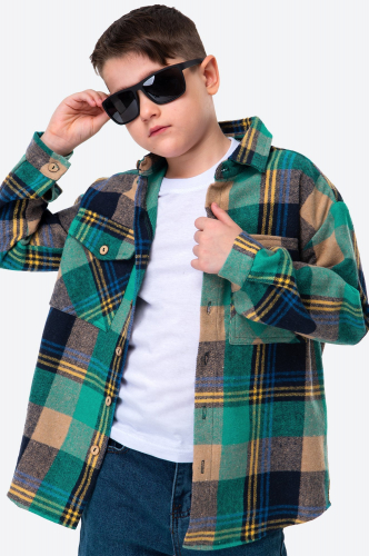Детская рубашка с длинным рукавом из мягкой фланели в клетку станет верным спутником в приключениях активного мальчика. Свободный крой и тёплая ткань обеспечивают уют и не стесняют движения. Акцентные роговые пуговицы и накладные карманы с клапанами добавляют образу стильный и брутальный шарм.