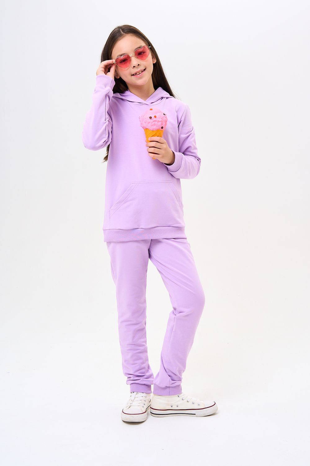 Костюм для девочек дошкольного и младшего школьного возраста. Костюм состоит из толстовки и штанов. Костюм из трикотажного эластичного хлопкового однотонного полотна футер . Толстовка с капюшоном, с длинным рукавом на манжете и поясе из основного полотна. На переде толстовки расположен карман-кенгуру. Штаны с боковыми карманами, на манжетах и поясе из основного полотна.