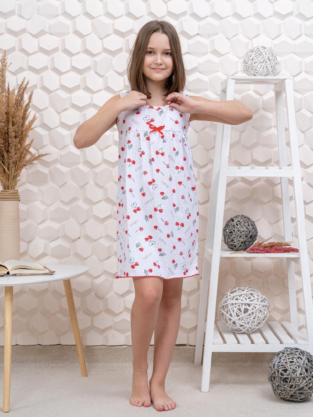Ночная сорочка для девочки из хлопкового полотна. О-образный вырез горловины и открытые проймы в совокупности со свободным силуэтом обеспечивают свободу движениям и комфортную посадку. Полочка изделия имеет отрезную кокетку и декорирована милым атласным бантиком. Низ сорочки обработан на краевой машине. Под кокеткой сделана сборка, что придаёт силуэту изящную трапециевидную форму. Удобная и приятная к телу, сорочка подарит комфорт и уют ребёнку.