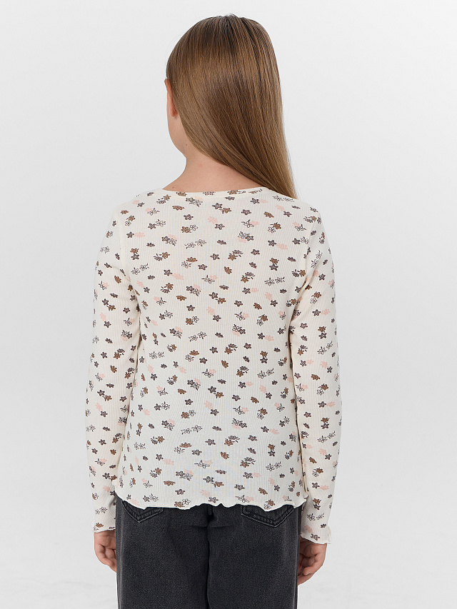 Бежевый джемпер для девочек с нежным цветочным принтом — элегантный вариант для школы и праздников. Прилегающий силуэт облегает фигуру, сохраняя свободу движений. Удобный круглый вырез и длинные рукава с фактурной резинкой добавляют модели аккуратный вид.