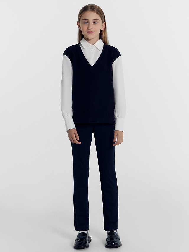 Школьный джемпер-обманка для девочки представляет собой модель свободного силуэта, которая сочетает в себе имитацию жилетки и рубашки. Этот дизайн придает джемперу особый шарм и делает его стильным и оригинальным. Жилет изготовлен из качественного селаника и имеет V-образную горловину. Рубашка, в свою очередь, выполнена из прочной ткани и имеет круглую форму горловины, а воротник украшен стойкой. По переду рубашки расположена центральная застежка на пуговицы, благодаря чему джемпер легко надевается и снимается. Стиль джемпера подчеркивается спущенным плечом и углубленной проймой, что придает модели особую свободу движений. Втачные рукава являются длинными и выполнены из той же ткани, что и рубашка. Низ рукава немного расширен и присборен, а по низу установлена отрезная манжета из ткани, которая создает аккуратный и стильный вид. Этот школьный джемпер для девочки - отличный выбор для создания школьного образа, который сочетает в себе комфорт и стиль. Он идеально подойдет для любого повседневного образа, подчеркивая индивидуальность и хороший вкус ребенка. Будьте уверены, что в этом джемпере ваша девочка будет чувствовать себя комфортно и выглядеть стильно каждый день. Рекомендуем!