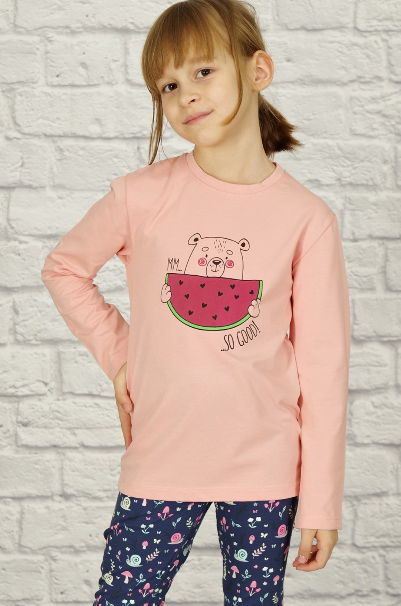 Для прохладных летних вечеров отличным вариантом будет футболка с длинным рукавом. Модель украшена симпатичным печатным рисунком. Хорошо сочетается и с юбкой и джинсами.