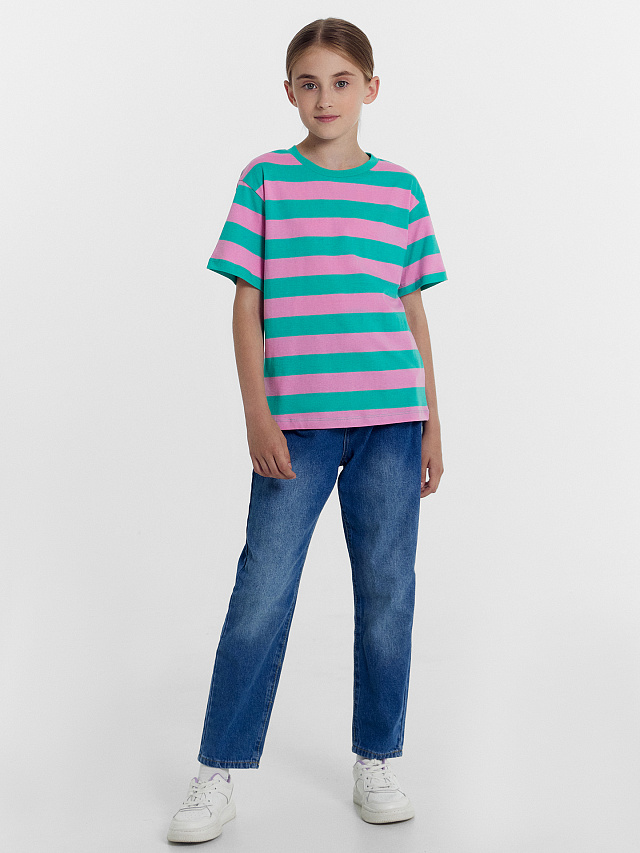 Футболка для девочек бирюзовая в розовую полоску