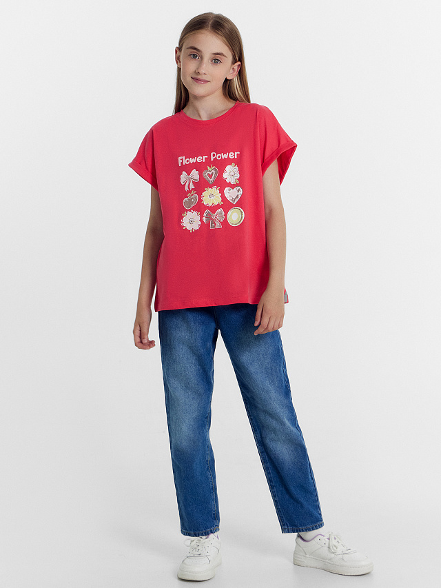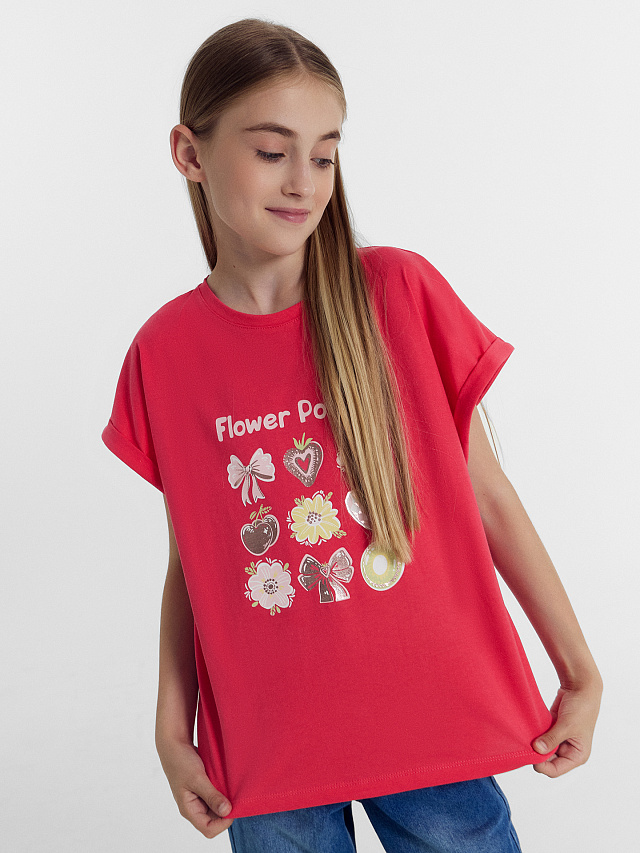 Футболка для девочек ягодно-красная с цветами