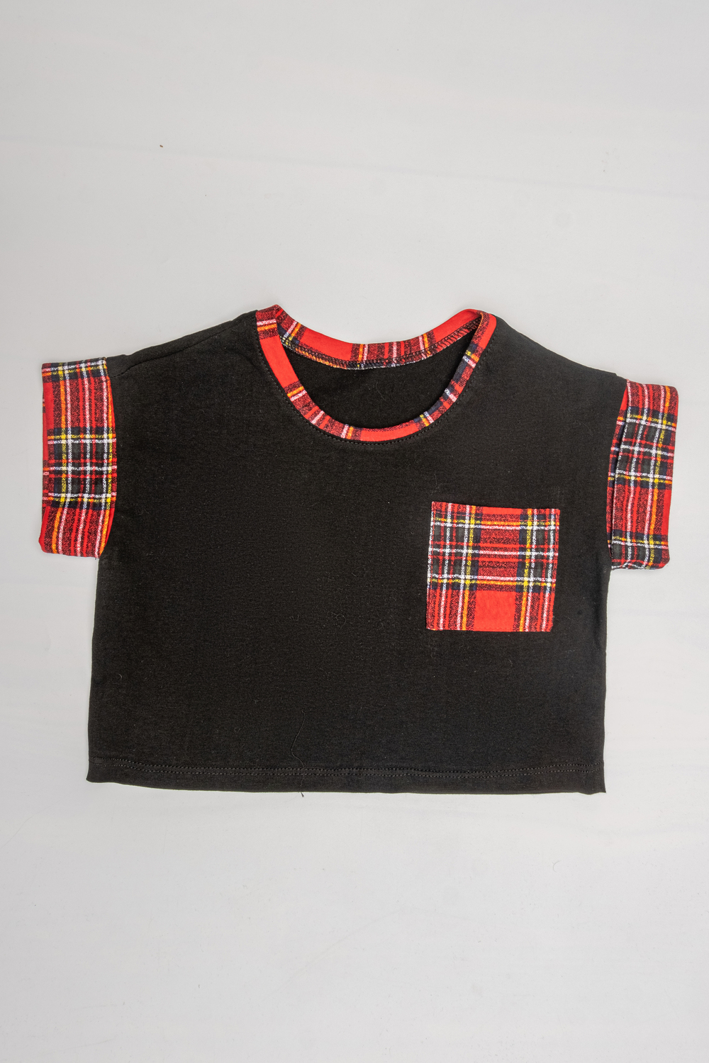 Черная футболка с клетчатыми элементами. Сшита из кулирки, которая отличается своим комфортом и легкостью в уходе. Футболку можно комбинировать со многими вещами гардероба девочки.