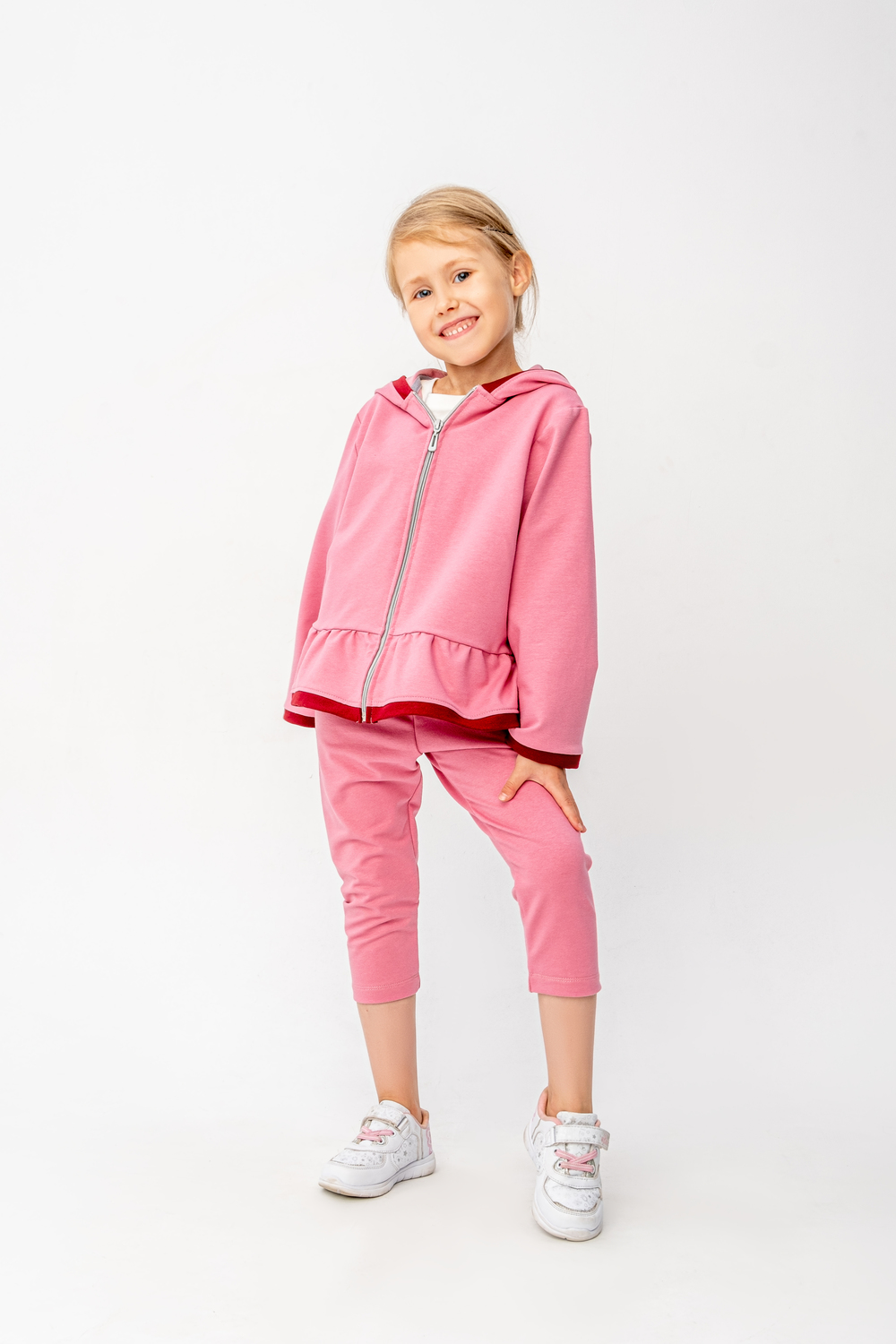Костюм из мягкого футера двунитки качества пенье. Свободный крой, худи с капюшоном, карманом, на молнии, бриджи прямые. Подходит для прогулок, для садика, для дома. Легкий в уходе, после стирки не линяет, не деформируется, не пилингуется.