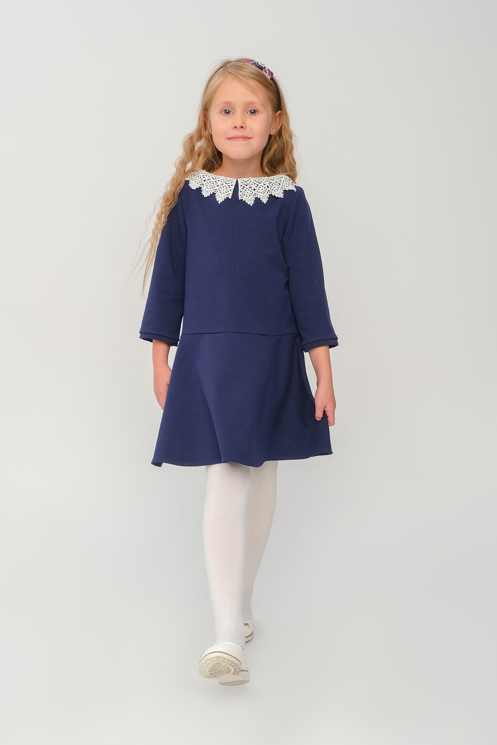 Классическое платье с кружевным воротником для девочки для особых случаев и для повседневного наряда. Стильное платье выполнено из трикотажного полотна двунитки, с кружевным воротником, с потайной молнией по спинке. Простое в уходе, легко стирается и утюжится.