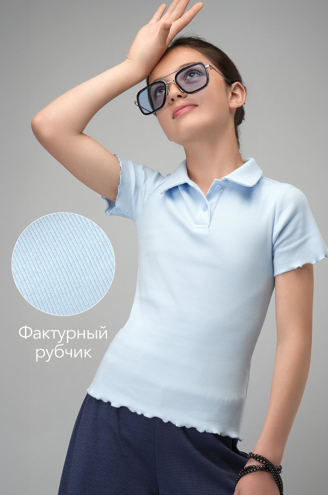 Нежный голубой цвет, милый волнистый к..показатьрай и аккуратный воротник — эта футболка-поло точно понравится девочке! Трикотажная блузка отлично подойдёт для летней погоды, будь то прогулка или поход в школу. Универсальная и однотонная, она легко впишется в повседневный гардероб подростка.