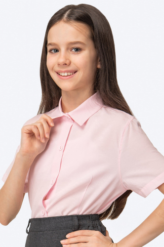 Блузка прямого кроя с короткими рукавами и отложным воротником с застежкой на планке выглядит аккуратно и стильно. Волнистый край на рукавах и по низу добавляет нежности и игривого настроения. Удобная, но при этом нарядная — отличный баланс для детского гардероба.