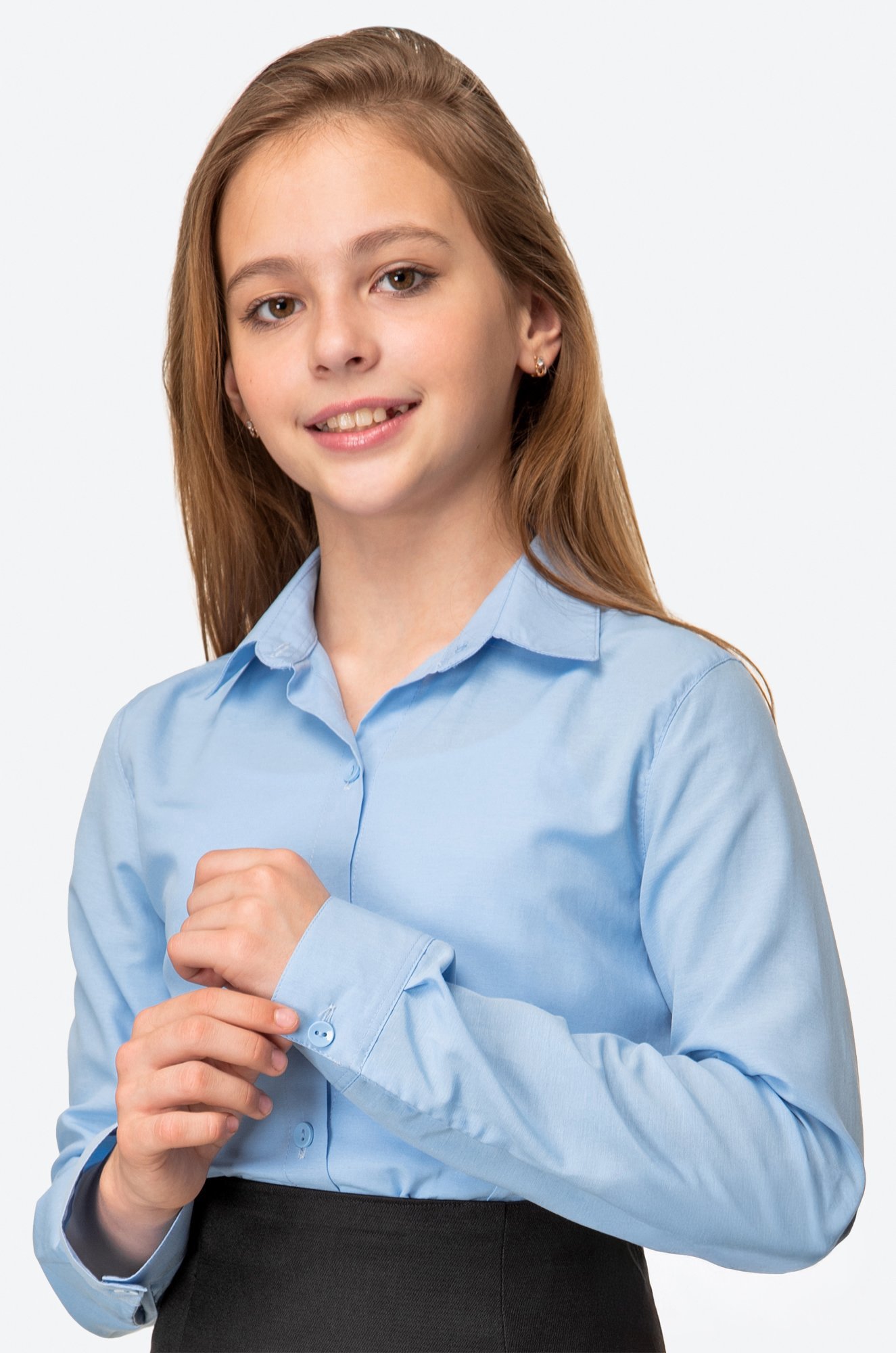 Бестселлер, покоряющий сердца! Базовая..показать голубая детская рубашка для девочек и подростков выполнена из приятного к телу хлопка. Однотонная школьная рубашка для детей не стесняет движений благодаря удобному приталенному крою.