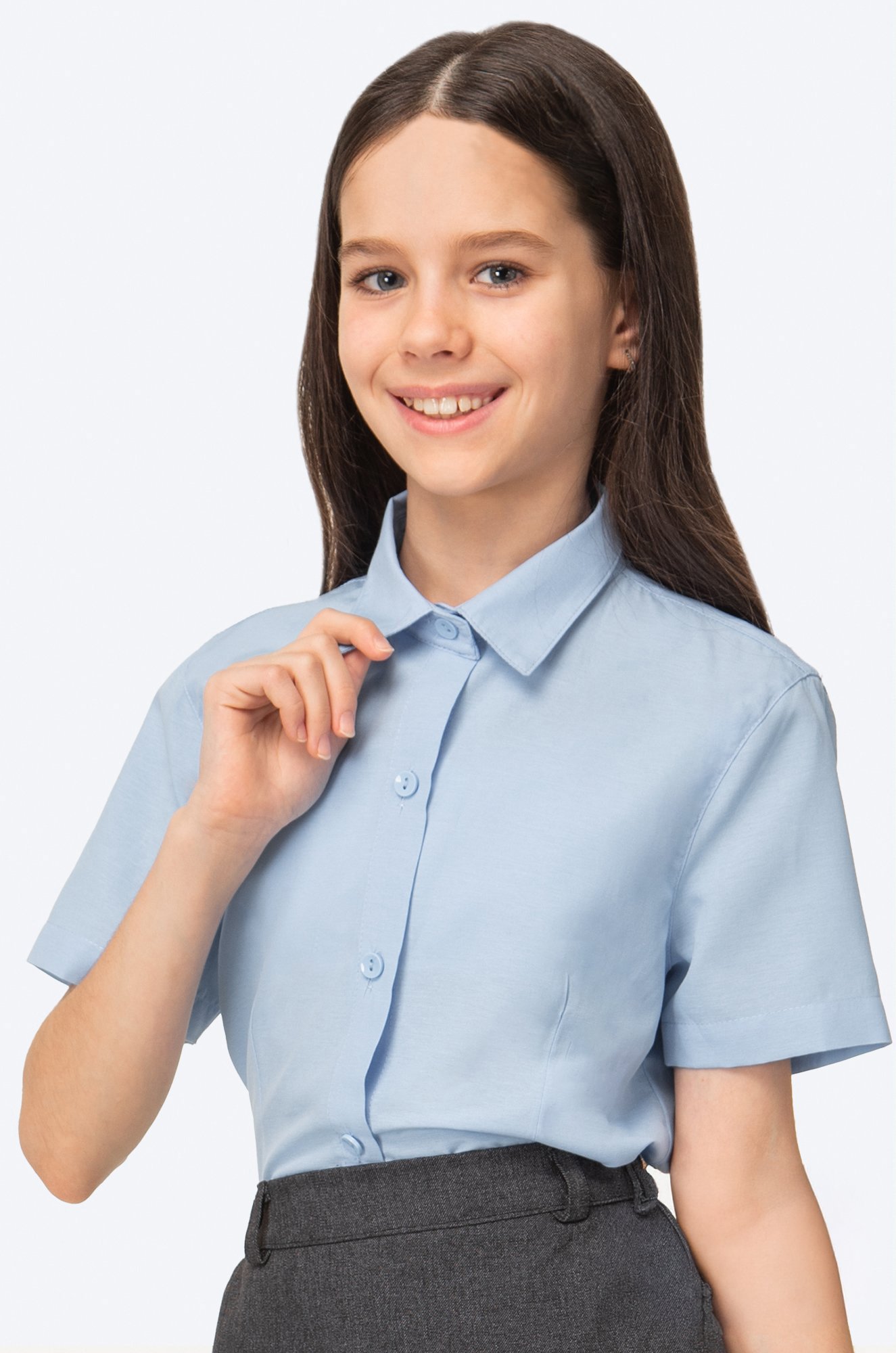 Базовая голубая детская рубашка для де..показатьвочек и девочек-подростков выполнена из приятного к телу хлопка. Однотонная школьная блузка для детей не стесняет движений благодаря удобному приталенному крою. Аккуратный отложной воротник, классическая застежка на пуговицы и короткий рукав делают образ сдержанным и опрятным.