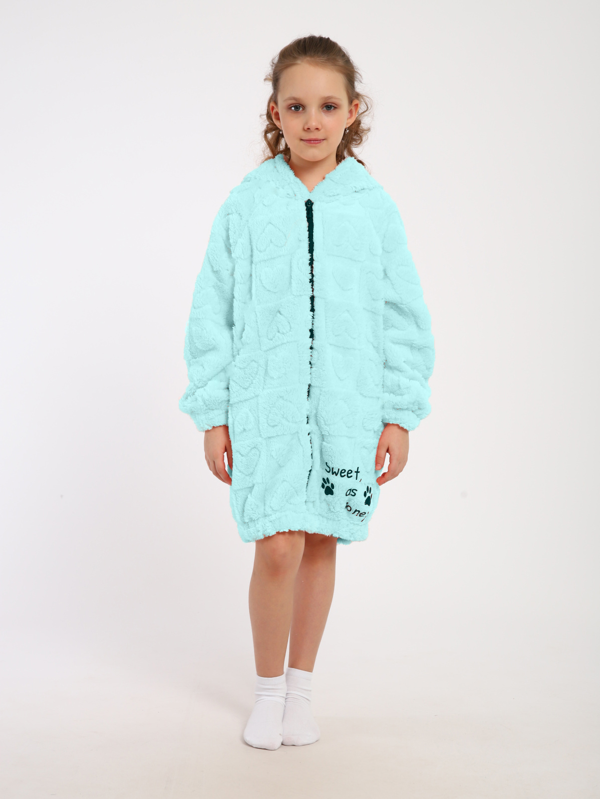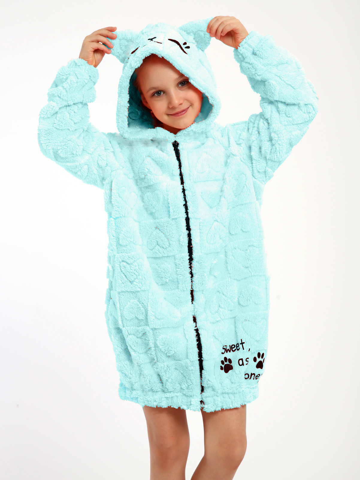 Теплый домашний халат от бренда ЛАДОШКИ станет любимой вещью для любой девочки-подростка. Изготовленный из мягкого и приятного на ощупь велсофта, он обеспечит максимальный комфорт и уют в прохладные дни. Халат средней длины с классическим округлым вырезом горловины и длинными рукавами прямого покроя идеально подходит для дома, дачи, бассейна или после душа.  Удобная застежка-молния спереди позволяет легко надевать и снимать халат, а вместительные карманы в боковых швах - хранить необходимые мелочи.  Оригинальный принт с милым котиком и несъемный капюшон с ушками из ткани добавляют халату игривости и стиля.  Этот теплый и уютный халат станет отличным подарком для любой юной модницы.