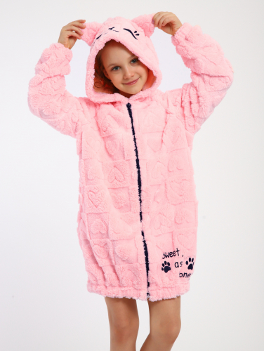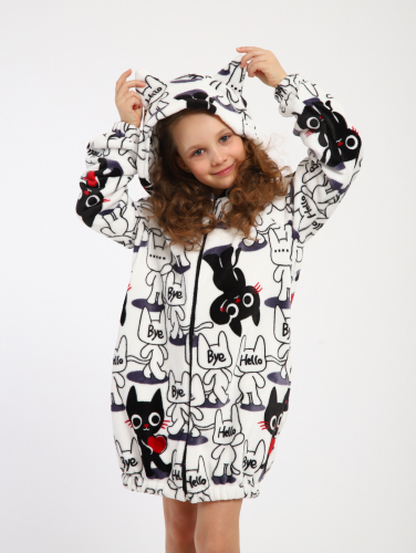 Особенностью данного халата является его дизайн: на фоне светлого основного цвета расположены привлекательные кошачьи лапки, что придает ему не только практичность, но и оригинальность. Застежка на молнии спереди обеспечивает легкость надевания и снятия.