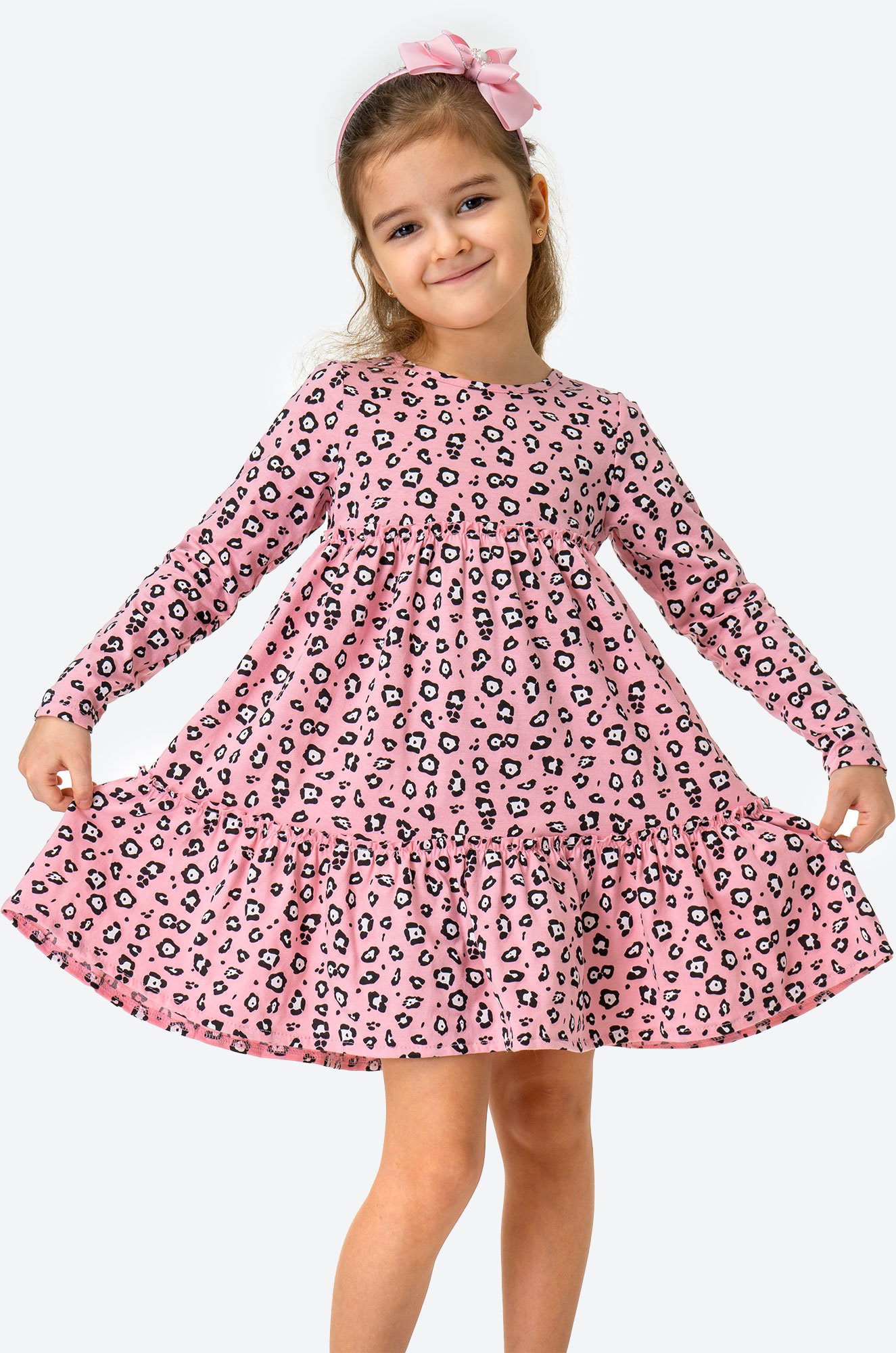 Воздушное платье для настоящих принцесс! Детское леопардовое платье для девочки выполнено из натурального 100% хлопка. Свободный крой, длинный рукав, удобная застежка на пуговицы – каждая деталь создана для комфорта ребенка. Благодаря классному анималистичному принту и воздушным сборкам на юбке платьице для детей поможет создать кокетливый образ.