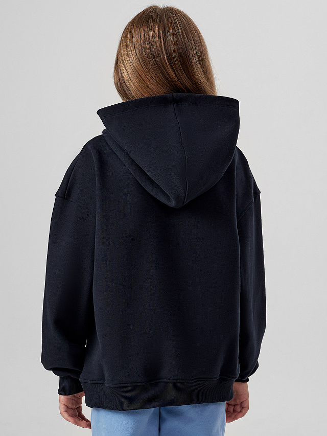 Худи для девочек, свободного силуэта (оверсайз), с капюшоном. Горловина округлой формы. Капюшон со средним швом, на подкладке из основного полотна. Шов втачивания капюшона закрыт хб тесьмой. Плечо спущено, рукав втачной длинный. По низу рукава отрезная манжета из рибаны. Пояс отрезной из рибаны, отстрочен. По переду карман кенгуру.