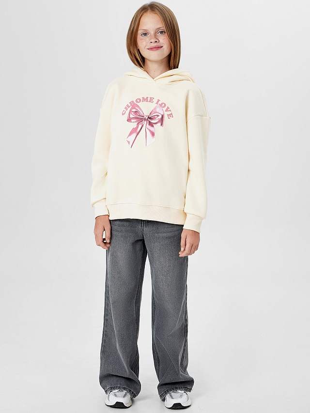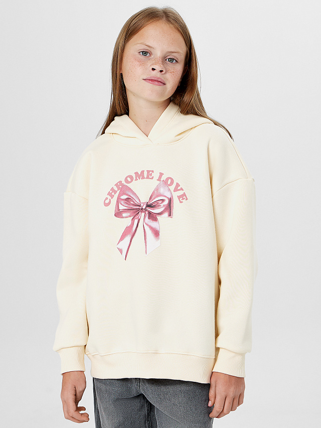 Бежевое худи для девочек с надписью «Chrome love» и принтом банта — это стильная и уютная вещь для повседневной носки. Модель силуэта оверсайз выполнена из мягкого трикотажного футера с начесом.