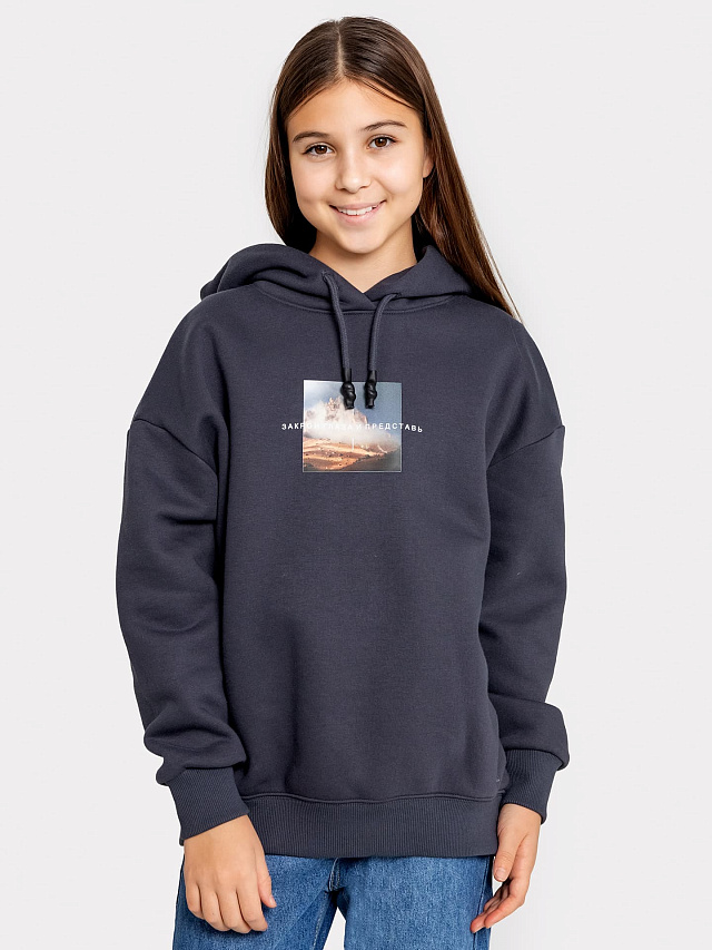 Стильное худи силуэта оверсайз для девочек, созданное из трикотажного футера с теплым подчесом. Модель из коллекции "Нетронутая красота" с принтом в виде надписи "Закрой глаза и представь". Округлая горловина, просторный уютный капюшон, длинные просторные рукава на манжетах - ничего лишнего. Дополнительную свободу дарит спущенная линия плеча. Комфортное и уютное - ваш лучший выбор на прохладное время года. Рекомендуем!
