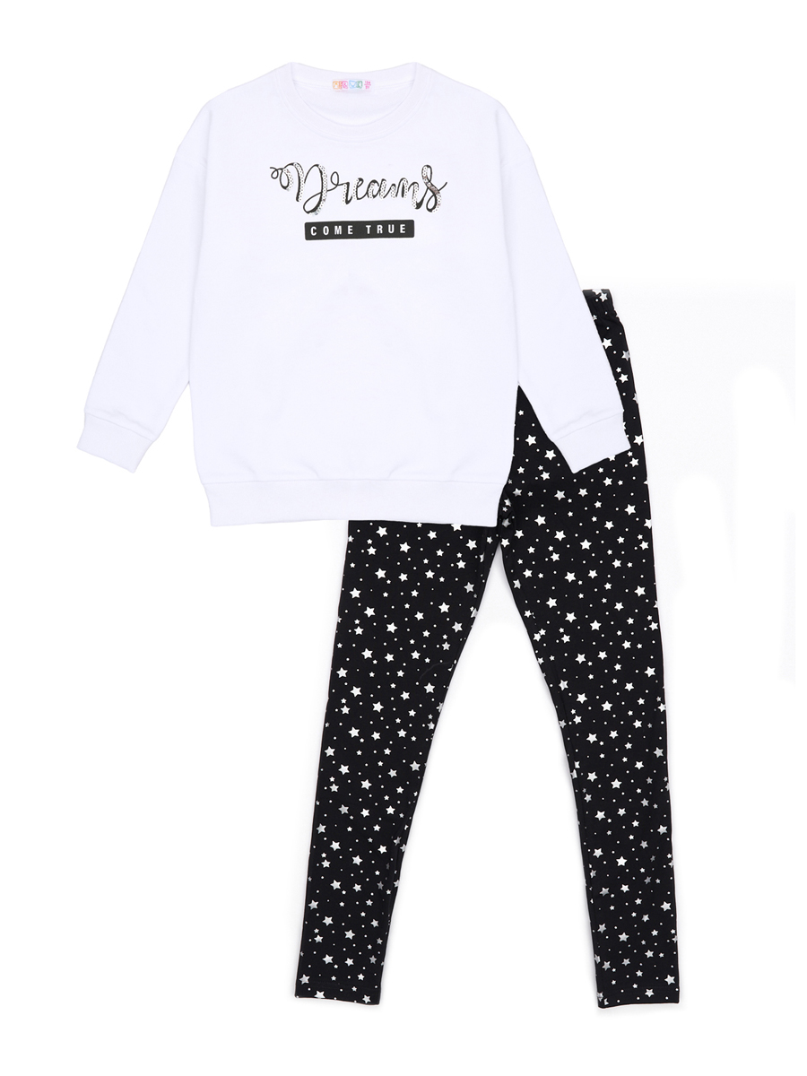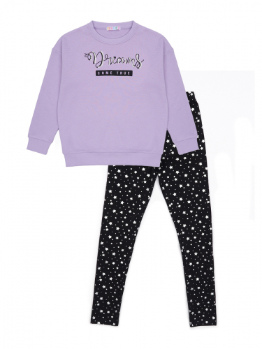 Верх свитшот: футер 3х нитка, оверсайз, длина ниже линии бедра. Декор: принт и пайетки. 100%Хлопок. Леггинсы: 92%Хлопок 8%Эластан, кулирка, декор - принт фольга.