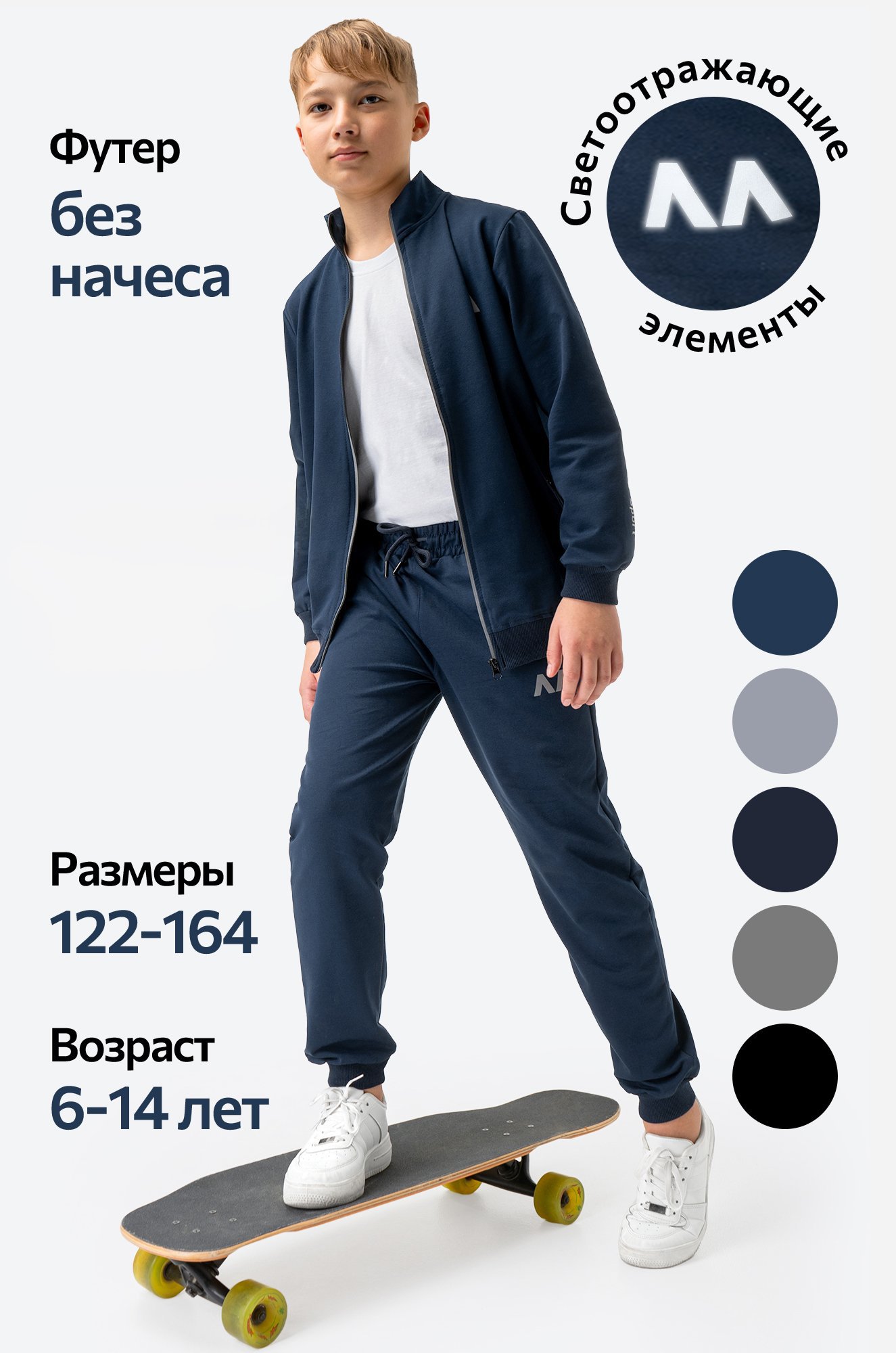 Комфорт в каждом движении! Детский спортивный костюм с брюками для мальчиков и девочек выполнен из плотного футера двухнитки. Толстовка с застежкой на молнию, мягкие манжеты и светоотражающие элементы делают синий костюм для детей и подростков стильным и практичным.