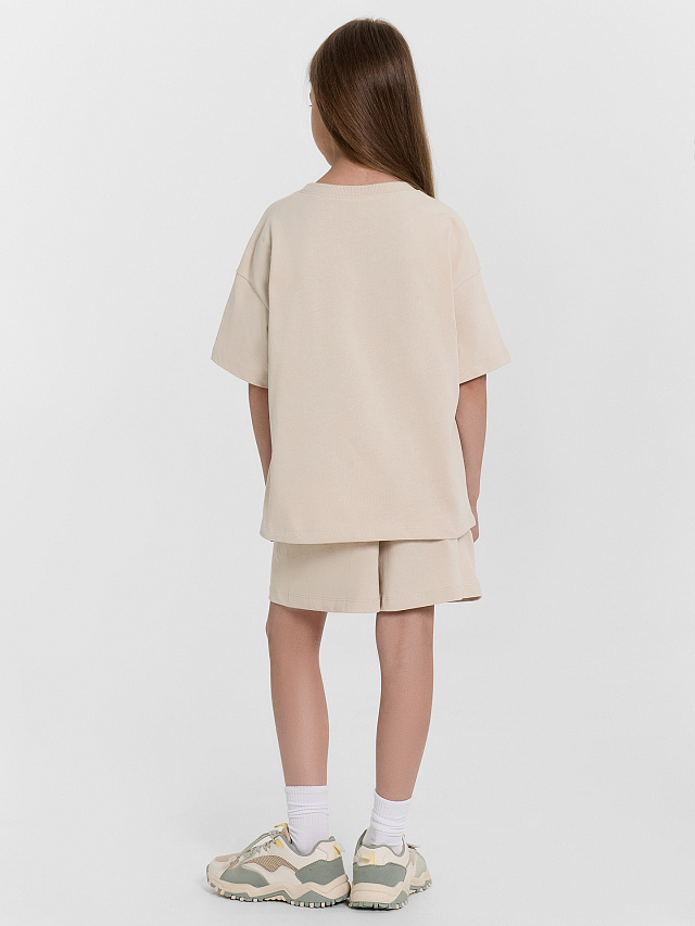 Комплект для девочек состоит из футболки и шорт.