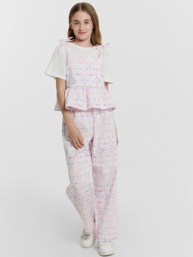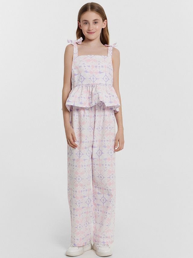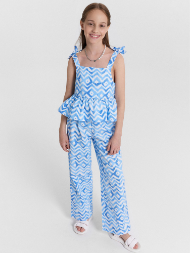 Этот элегантный комплект для девочек — нежное и комфортное сочетание утонченного дизайна и удобного кроя, созданное для стильных образов. Топ на бретелях полуприлегающего силуэта подчеркивает легкость и женственность, а завязки на бантики добавляют игривый акцент, делая модель особенной. Благодаря свободному крою, топ не сковывает движений, обеспечивая комфорт в течение всего дня. Брюки прямого кроя с посадкой на талии создают гармоничный силуэт, а эластичный пояс мягко прилегает к телу, не вызывая дискомфорт. Низ изделия застрочен швом в подгибку, что делает модель аккуратной и износостойкой. Комплект выполнен из натурального хлопка, который обеспечивает воздухопроницаемость и приятные ощущения на коже, делая его идеальным для теплого сезона. Практичный и стильный, этот комплект легко сочетается с разными аксессуарами, позволяя создавать нежные и элегантные образы!
