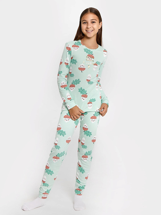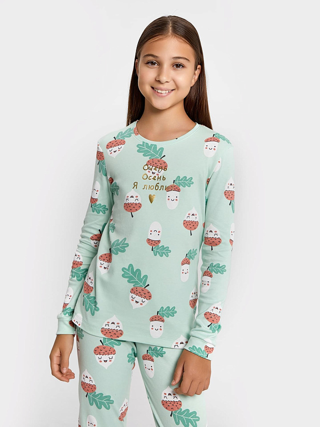 Комплект для девочек (джемпер, брюки) в зеленом оттенке с принтом "желуди"