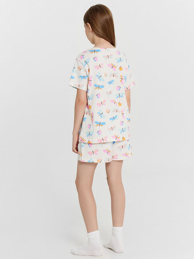 Пижама для девочек. Выполнена из трикотажной кулирки. Состоит из футболки и шортиков. Футболка свободная, с круглой горловиной, короткими рукавами. Шорты свободные, длиной до колен, пояс с эластичной тесьмой внутри. В такой пижамке сны будут действительно приятными!