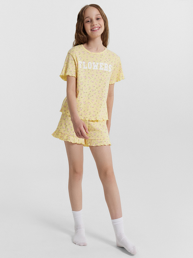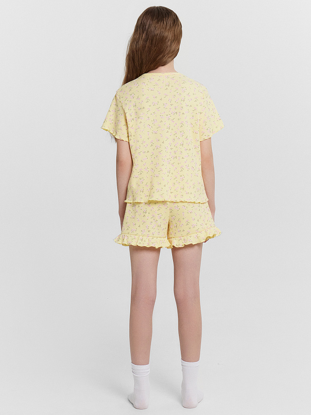 Комплект состоит из футболки и шорт. Футболка прямого силуэта. Перед и спинка цельнокроенные. Горловина круглая окантована бейкой из основного полотна. Низ рукавов и изделия обработаны микрооверлоком.