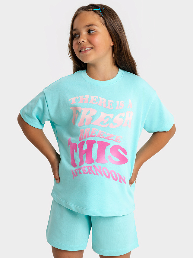 Комплект для девочек (футболка, шорты) бирюзового цвета с принтом
