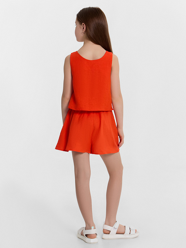 Комплект состоит из топа и шорт. Топ А-силуэта. Перед и спинка цельнокроеные. Круглый вырез горловины. Обтачка горловины и пройм из основного полотна. Низ топа обработан швом в подгибку сзакрытым срезом.