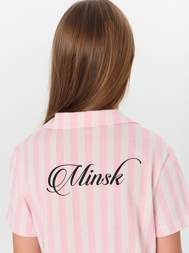 Комплект состоит из рубашки и шорт. Рубашка прямого силуэта, с отложным воротником, спинка цельнокроеная. Плечо слегка спущено. Рукав втачной, одношовный, короткий. Центральная застежка на пуговицы.