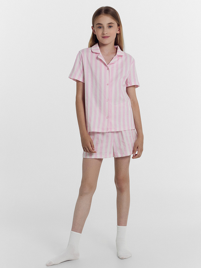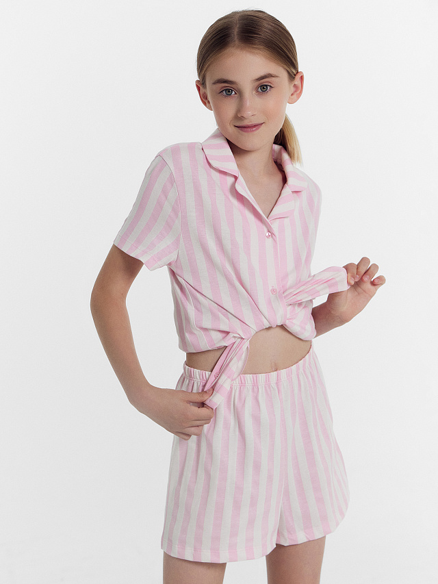 Комплект для девочек (рубашка, шорты) белый в розовую полоску